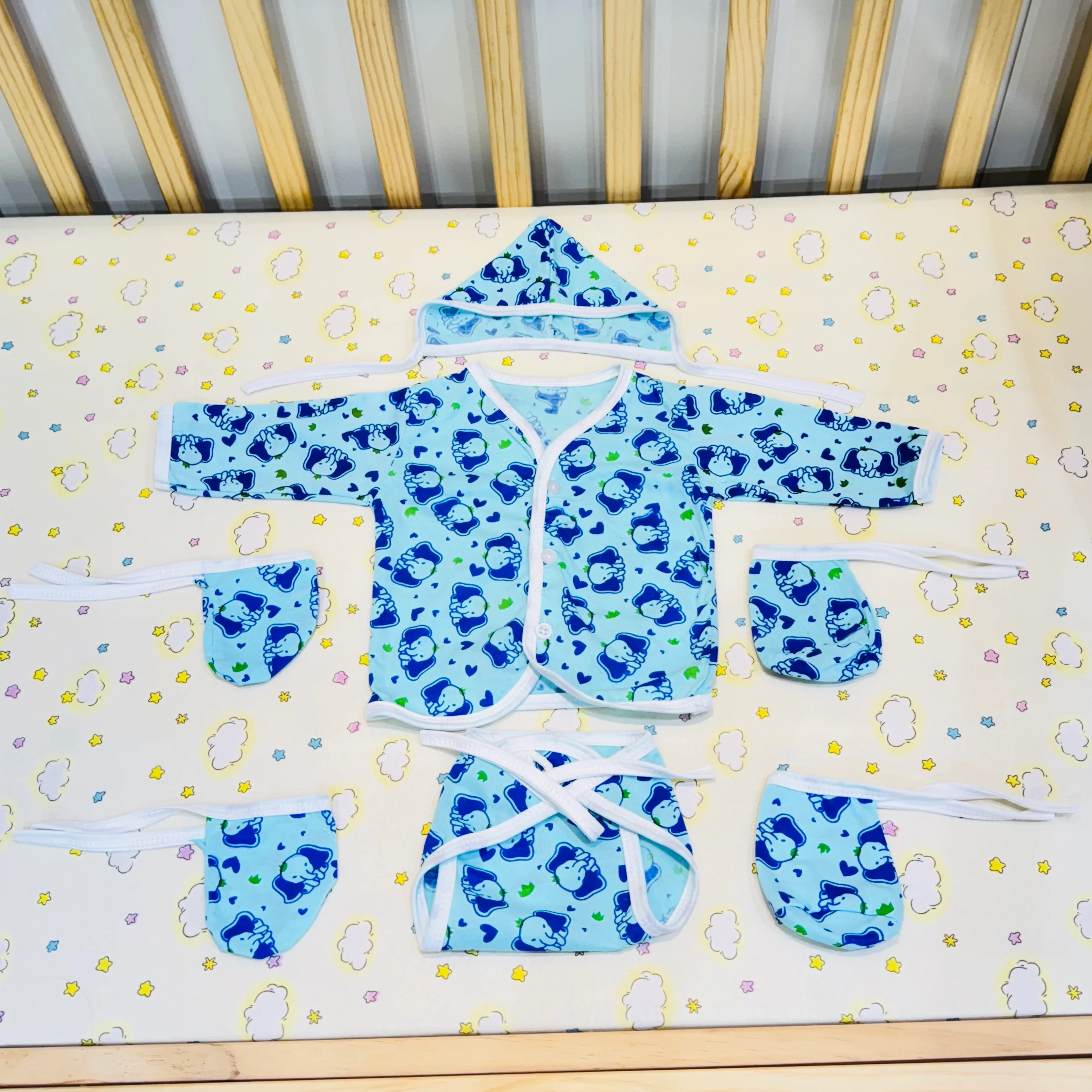 Pack contains: 1 Waterproof sheet | 1 mustard pillow | 1 bed | 1 shirt | 1 nappy | 1 cap | 1 mittens set | 1 socks set. Total items: 8