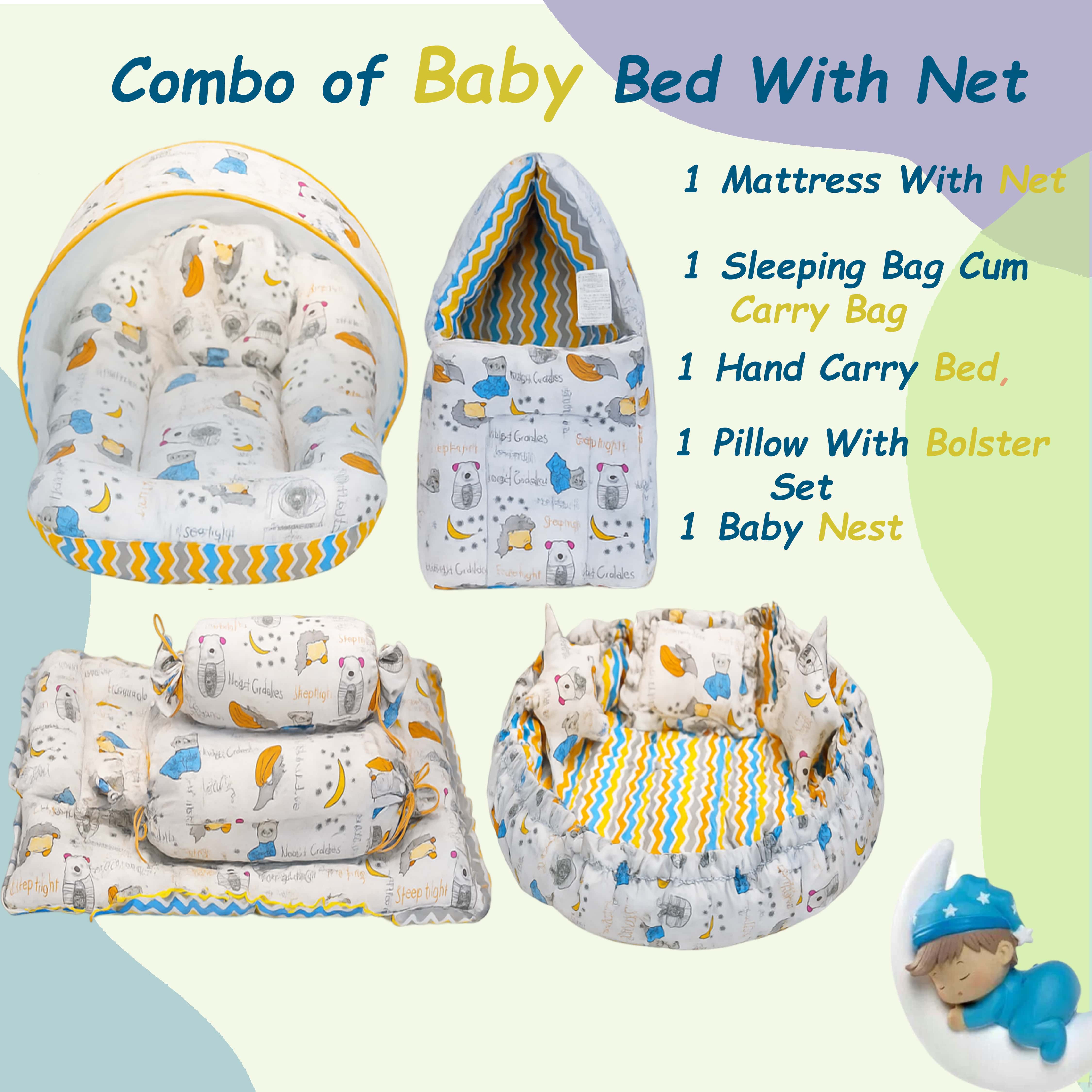 This combo pack includes everything your baby needs for a comfortable and peaceful sleep, including a mattress with a net, a sleeping bag, a baby nest, a hand carry bed, and a pillow set with a bolster a blanket