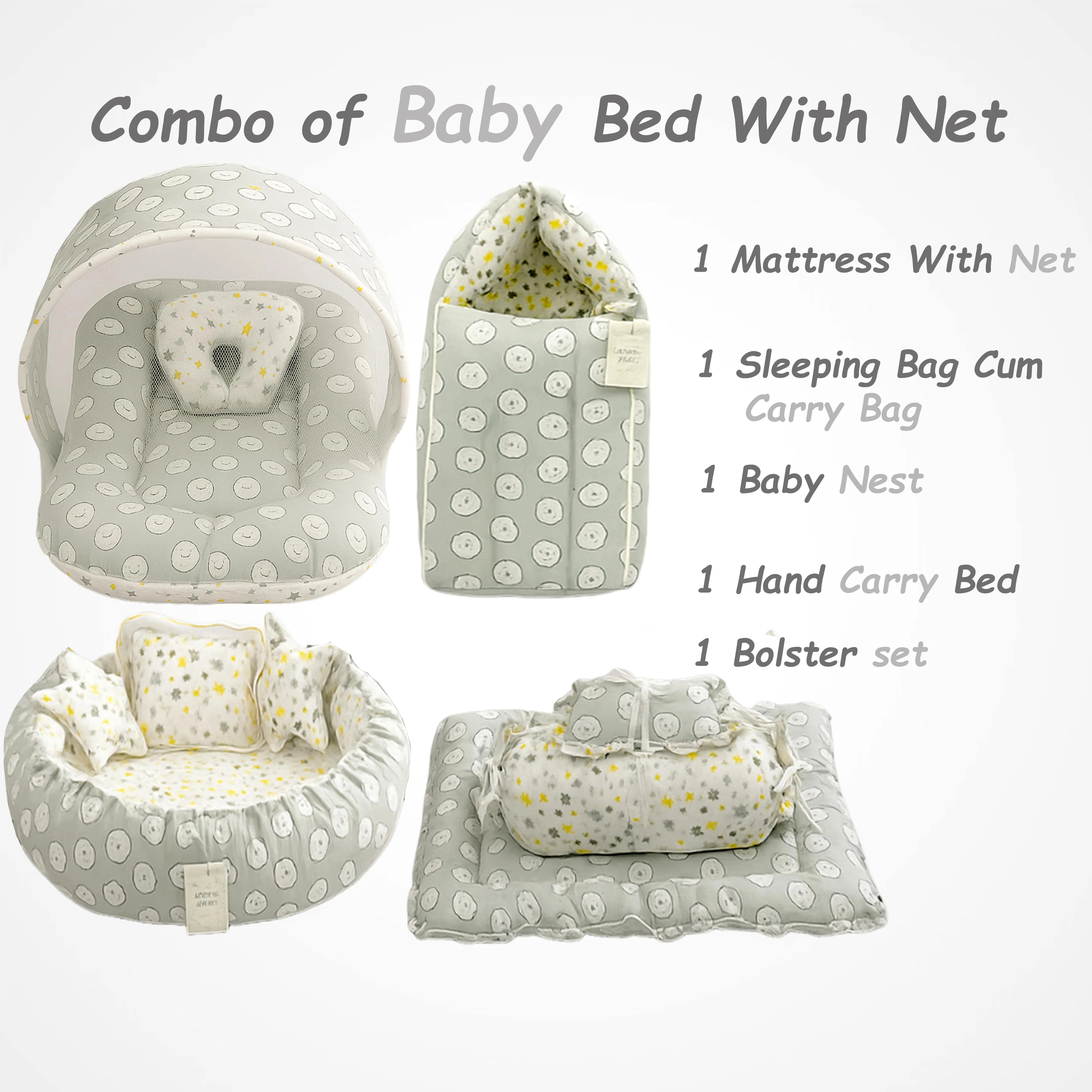 This combo pack includes everything your baby needs for a comfortable and peaceful sleep, including a mattress with a net, a sleeping bag, a baby nest, a hand carry bed, and a pillow set with a bolster a blanket